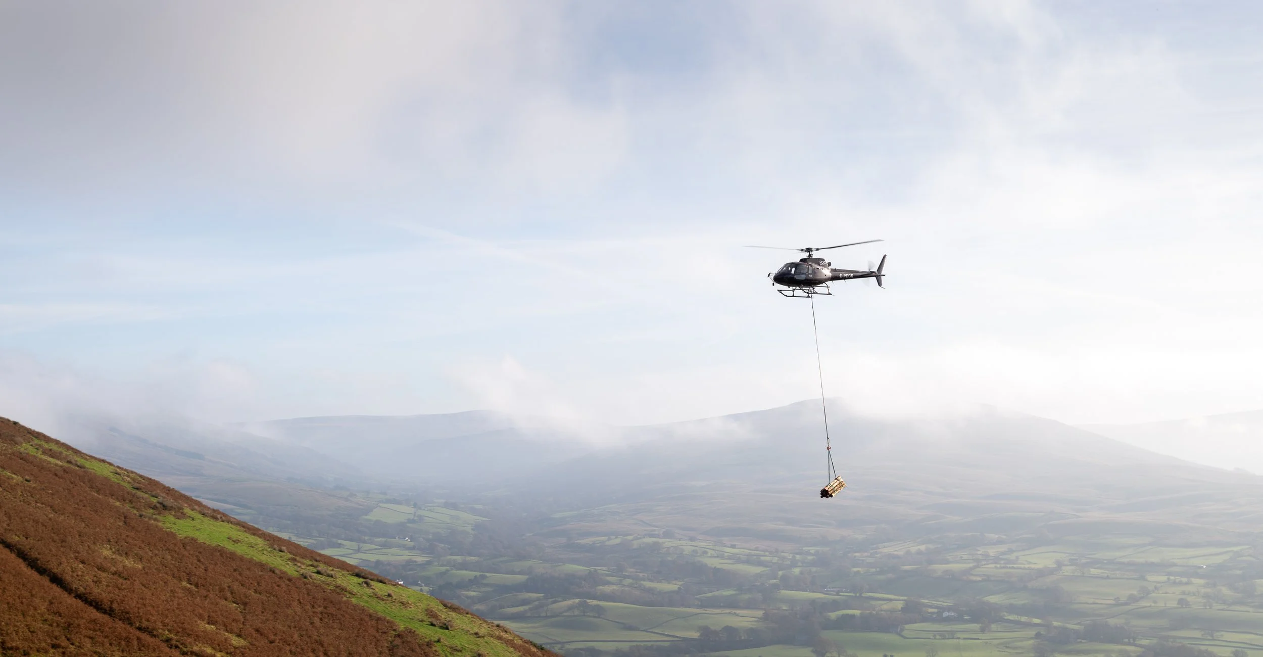 Yesterday (Wednesday 13 November), a helicopter spent the day moving whole larch trees up the steep side of Brant Fell to the areas identified by JBA and the commoners as the best place for 22 leaky barriers. Leaky barriers, made from the logs, slow down and intercept the movement of water.